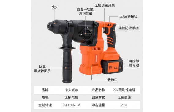 卡夫威爾(KAFUWELL)直流式無刷電動工具系列 工業級鋰電錘PA4574H,捶鉆打孔,錘擊開槽,裝修、工用面面俱到